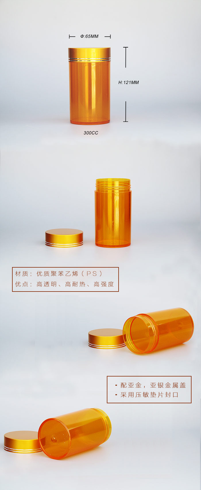 300ccPS高(gāo)透塑料瓶容(róng)量:300cc。